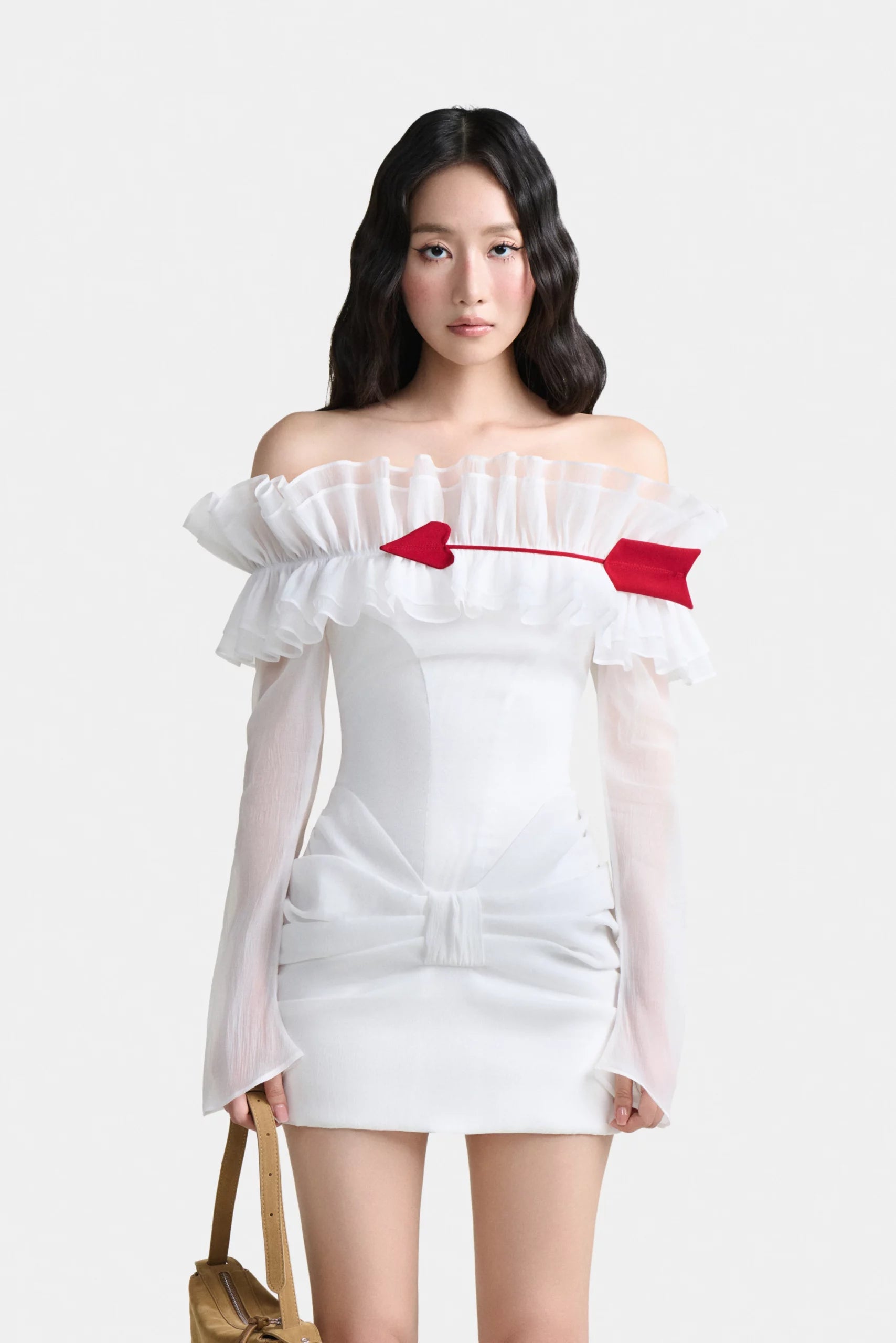 Infused with the essence of romantic love, the Darling Off-Shoulder Dress captivates with its graceful off-shoulder silhouette and flowing long sleeves. A delicate bow at the waist, paired with voluminous pleats adorned with a Cupid’s arrow, adds a dreamy touch. Designed for José to shine in her most cherished moments of love.