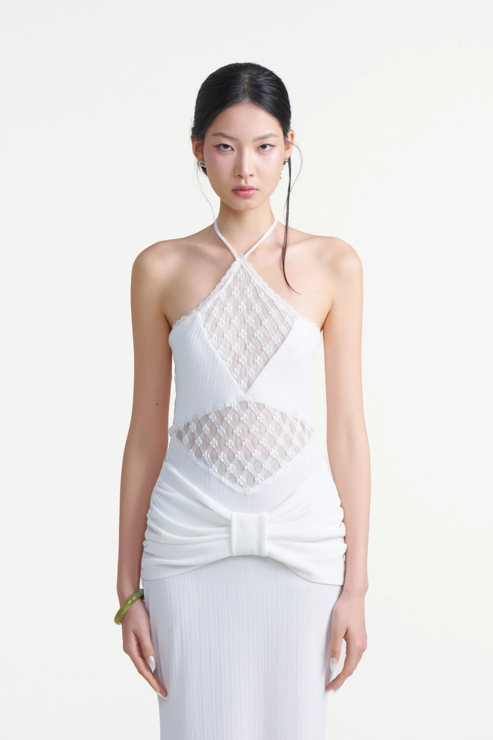 YUKI MIDI HALTER DRESS features a delicate design with lace accents and a soft bow detail, creating a graceful and refined image for José during the early days of the year. The dress flows gently, like a spring breeze, carrying hope and freshness in every moment.